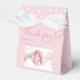 Un baby shower photo boîte de faveur. Merci élégante typographie de script. Personnalisez le nom et la date. Couleurs roses pour une fête de babyshower pour petite fille. De bonnes fournitures de fête pour un nouveau bébé. Une étoile blanche se trouve à l'arrière du ballotin.