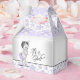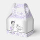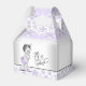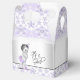 Boîtes de faveurs pour baby shower filles avec une adorable bébé fille portant un pantalon à volants lavande violet sur un joli fond de dentelle grise et violette. Vous pouvez ajouter votre propre texte et déplacer les bébés et le texte selon vos besoins. Vous pouvez également supprimer le texte 'c'est une fille'.