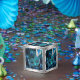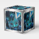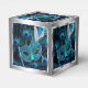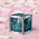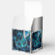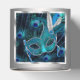 Boîte de faveur de bal masqué de paon. Belle boîte de faveur de bal masqué argentée et bleue royale avec un magnifique masque à plumes bleu sarcelle sur un fond élégant de plumes de paon bleues.