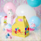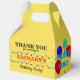 Un anniversaire amusant merci ballotin de remplir avec des petites gâteries spéciales. Personnalisez avec le nom de l'anniversaire en rouge. Personnaliser l'âge à la place de l'échantillon 13ème sur le côté indiqué en bleu. Arrière - plan jaune soleil avec des pois colorés en bleu turquoise, rose, jaune et noir, et ballons volant colorés et festifs. Oeuvre originale Design par TamiraZDesigns.