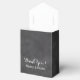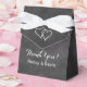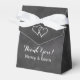 Ballotin noeud de mariée sur plateau avec texte personnalisé pour remercier les invités. Message de remerciement personnalisé de la mariée et du marié. Impression d'image arrière - plan de tableau noir avec typographie manuscrite stylisée. Comprend l'élégant ruban blanc. Modèle de texte personnalisable. Design à thème vintage tendance avec double coeur d'amour. Jolies accessoires pour mariage fantaisie, anniversaire, fiançailles heureux ou douche nuptiale. Couleurs noir et blanc. Changez la quantité pour obtenir le prix en vrac bon marché. Ballotins en forme de tente.