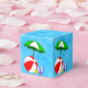 Une boîte de fête avec une boule de plage rouge et blanc, un parasol de piscine vert et des sandales sur un arrière - plan bleu aquatique. Cliquez sur Customiser pour ajouter votre nom ou votre message, modifier les couleurs des arrière - plans, même enregistrer votre conception pour plus tard.