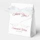 Ces ballotins de remerciement sont la meilleure façon de remercier les membres de votre mariage d'avoir fait partie de votre journée spéciale. Remplir de bonbons, de faveurs de mariage ou de cadeaux. Elles présentent un design simple mais élégant de texte en écriture rouge sur un arrière - plan blanc avec une bordure florale en fausse feuille. Entièrement personnalisable pour pouvoir entrer les informations dont vous avez besoin.