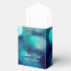 Bokeh bleu turquoise effet photo Ballotin de mariage personnalisé avec texte personnalisé pour remercier les invités. Message de remerciement personnalisé de la mariée et du marié. Image Abstraite du parti ruban blanc noeud d'arc. Arrière - plan personnalisable