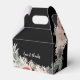 Elégante ballotin noire fleurie boho avec un design romantique et verdoyant. Customisez avec les noms du couple et la date du mariage. Un saké intemporel et parfait pour des gâteries ou des cadeaux de remerciement.