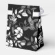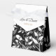 Fabuleux ballotin en forme de tente a un joli motif floral en noir et blanc et un arc ruban en haut. Montré en arrière - plans noirs et blancs et a les prénoms des jeunes mariés. Customisez cet élément et modifiez l'exemple de texte sur le vôtre. Image stock.