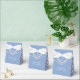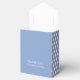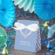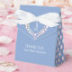 Boîte cadeau de remerciement pour une fête d'anniversaire de mariage de cristal personnalisée avec votre nom. Idéal pour ajouter une touche personnelle à une fête d'anniversaire de mariage de 3 ans, à des dîners et à des réunions informelles. Emballage cadeau idéal pour des faveurs ou à placer sur les tables de réception ou les tables de fête remplies de friandises ou de cadeaux. Ferait également un beau cadeau de départ commémoratif de remerciement. Pierres de cristal en forme de cœur bleu et blanc, création artistique et design de Sarah Trett pour www.mylittleeden.com