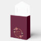 Sur le volet avant : écriture manuscrite dorée et texte : Baby shower. Avant et arrière : Un arrière - plan chic bordeaux avec un cadre géométrique en faux or. Décoré de fleurs violettes foncées et bordeaux, de plumes roses et boho. Le nom est écrit avec un script de style à la main doré et le texte : Merci, modèles pour un nom et une date, lettres d'or et chiffres. Parfait pour un Baby shower pour une fille ou un sexe neutre.