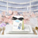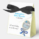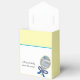 Élégant hochet argenté en vert tendre avec une étoile bleue et un arc faux perlé. Baby shower maman-to-be Nom typographie en bleu. Insérer la date de Baby shower. Un bébé doux est en route en écriture noire. Arrière - plan jaune et blanc pastel avec bandes géométriques bleues. Conception d'oeuvres originales par TamiraZDesigns