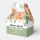 Cette boîte de faveur de mariage présente une belle conception d'une branche ornée de fleurs de roses de pêche et de feuilles verts. Les noms du couple sont élégamment affichés dans une typographie audacieuse, tandis qu'un message de "Merci" sincère est également intégré dans le design. Pour ajouter une touche de sophistication, une bande verte sage est positionnée au bas de la boîte, complétant le look général avec un détail subtil mais élégant.