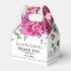 Cette boîte de faveur de mariage présente des branches d'eucalyptus aux fleurs roses et feuilles verts sauge. Les noms du couple sont élégamment exposés dans la typographie décorative. Un message de "Merci" est également inclus, exprimant sa gratitude aux invités. Pour compléter le look, une fine ligne noire design ajoute une touche de sophistication au bas de la boîte.