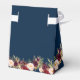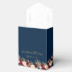 Boîte de faveur de mariage personnalisée avec aquarelle rouge Bourgogne, écriture en Merci doré avec nom de mariée et de mariée et date de mariage en écriture en or typographie superposition imprimée sur un arrière - plan bleu marine solide.