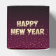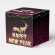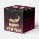 fondo de color cereza degradado con feliz año nuevo en dorado con letra que se desvanece y animal navideño dorado.