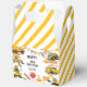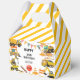 Ce design comprend quatre camions de construction classiques en jaune gras disposés ensemble sur un arrière - plan marron et noir. Il comprend d'autres éléments de construction comme des rails de garde et des cônes de circulation et des bandes de trafic noir et jaune. Nous vous avons couvert pour une soirée à thème camions de construction : fournitures, déco, délicieuses friandises et cadeaux personnalisés significatifs!
