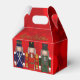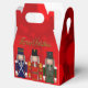 Christmas Nutcracker Trio - Trois Nutcrackers debout côte à côte sur un motif de Noël rouge. Le premier casse-noix est habillé de bleu et de blanc avec des ornements dorés. Le biscuit central est habillé de rouge et d'or avec des ornements dorés. Le troisième casse-noix est habillé en vert et blanc avec des ornements en argent. Les noix de cou sont à l'avant et à l'arrière de la boîte avec un script en or qui dit : Joyeux Noël. Chacun de ces noix de cou est disponible séparément sur divers cadeaux et produits Zazzle. La coordination des cadeaux Zazzle et des fournitures de fête est disponible.