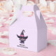 Un petit ballotin avec une amusante illustration thématique Halloween pour les amoureux de les chats. Un gros chat noir aux yeux vêtu d'un grand casquette de sorcière noire avec une ceinture rose violet autour du bord.