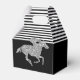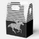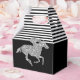 Les boîtes de faveurs de fête Gable présentent un cheval de course en paillettes argentées sur des rayures noires et blanches en haut et noires en bas - changez les couleurs de fond à votre guise ! Idéal pour une fête de Derby, une douche de nuptiale Derby, une fête d'anniversaire, une fête de retraite et plus encore. ARTICLES apparentés dans notre magasin.
