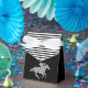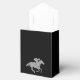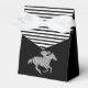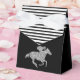 Les boîtes de faveur de fête de style tente à fermeture à ruban de douche de mariée présentent un cheval de course en paillettes argentées sur fond noir et des rayures noires et blanches en haut. Changez les couleurs de fond comme vous le souhaitez ! ARTICLES correspondants dans notre collection.