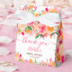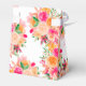 Sac cadeau de remerciement pour une douche de mariée moderne et girly avec un bouquet de fleurs orange vif, pêche, rose et vert et une police de caractères élégante.