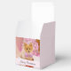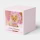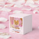 Un tout petit ballotin de 2 pouces sur 2 pouces avec un adorable chien de Noël portant une jolie cravate en arc rose. Ce minuscule animal est assis dans une boîte de casquette fantaisiste. Un arbre blanc décoré de lumières roses dans l'arrière - plan. Les lumières sont floues, ce qui donne un effet bokeh magique. Photo sur le thème de Noël chéri. Parfait pour les amoureux de les chiens.