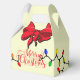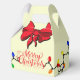 This favor gift box is printed on with an image of Merry Christmas on front and back along with Christmas tree lights wrapping around the entire box. Two large red bows cap the front and back panels. Change color of text if desired.