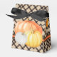 Le Citrouille Still Life Design est parfait pour la saison d'automne. Ce Ballotin présente une vie calme de citrouilles, sur le devant (blanc, jaune et orange). Les panneaux latéraux ont des feuilles orange et jaune vif. Tous ces éléments sont recouverts d'un motif arrière - plan de diamants bruns et beiges. Au fond du design se trouve une bande orange et marron. Le cercle au dos peut être customisé pour toute occasion spéciale avec votre propre texte.