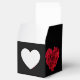 Belle rose rouge et pétales de rose disposés en forme de cœur se détachant sur fond noir. Boîte à cadeaux étonnante avec une découpe en forme de cœur sur le devant.