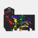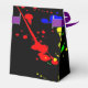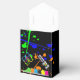 Style tente noire avec ballotin ruban violet avec une image sur le devant de plaques de peinture rouge, orange, jaune, vert et bleu, baskets haut-de-gamme dans les couleurs néon, cassettes, lunettes de soleil colorées et la phrase "Coincé dans les années 80" en lettres néon. Voir confettis assortis, sac de faveur, étiquette de faveur, sacs cadeaux, étiquette, autocollant carré, autocollant vinyle taillé sur mesure et papier d'emballage. Voir l'ensemble de la collection de Ballotins Tubulaires 80s dans les TOUCHES SPÉCIALES | Section Favoris.