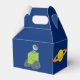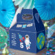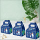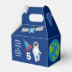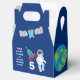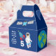 Un cool de l'espace extra-atmosphérique astronaute soirée à thème faveur boîte en bleu pour un enfant anniversaire. Comprend un astronaute enfant génial à côté d'un vaisseau-fusée dans la galaxie. Les côtés sont décorés de planètes, de vaisseaux spatiaux et de la planète Terre. Customisez avec votre message de remerciement pour un paquet de faveur pour la fête à thème galaxie.