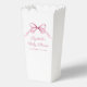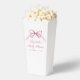 Belle fête préférez les boîtes de pop-corn pour votre douche bébé fille avec des couleurs d'eau douce rose coquette arc. Les mots "Baby shower" et le nom de la future mère sont présentés dans un élégant script rose.
