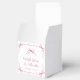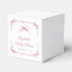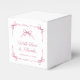 Belle soirée de faveur boîtes pour votre bébé douche fille avec des aquarelles roses douces de rubans délicats et des arcs de coquette, mélangeant une esthétique minimale avec une touche de charme vintage. Les mots "With Love & Thanks", "Baby shower" et le nom de la future mère sont présentés dans un élégant script rose.