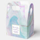 Minuscule ballotin avec une belle peinture artistique. Créé avec des encres d'alcool à couler. Couleurs violettes, vertes et bleues qui se mélangent. Des rubans d'or ondulés minces se mêlent à ces couleurs douces et douces. Un carré blanc avec une fausse bordure en feuille d'or superposée avec votre texte à l'intérieur.