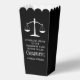 This custom black law school graduation party popcorn favor box features the college graduate name in white typography for the class of 2026. Customize with your university under the scales of justice for a great graduation keepsake for a new lawyer or attorney.