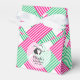 Et la voilà partie pour l'autel ! Boîte de faveur de fête de style tente avec fermeture à ruban blanc présentant une dame dans son chapeau de Derby sur le devant avec votre message sur un fond de blocs diagonaux de bandes rose vif, vert et blanc. Boîtes amusantes pour la douche de la mariée ou changez le texte et utilisez pour une fête d'anniversaire ou toute autre occasion. 3" de large x 1,5" de long x 3,25" de haut. Articles CORRESPONDANTS dans notre magasin.