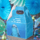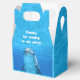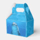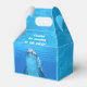 Boîte de faveur de la partie dauphin avec poignée. Eau bleue avec photographie dauphin et un endroit pour ajouter votre libellé personnalisé. Dites "merci" aux invités de la fête en remplissant cette mignonne petite boîte avec des bonbons. Bonbons, autocollants et petits jouets peuvent être transmis à des amis. Un exemple de libellé, en lettres blanches ondulées, est "Merci d'être venu à ma fête!" et est imprimé sur le dessus avant. Le visage du dauphin sous-marin est imprimé à l'avant et à l'arrière.