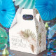Cette conception présente une floraison bohemienne neutre avec des feuilles de palmier, des plumes et une police rétro audacieuse.