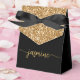 Boîte de faveur personnalisée élégante moderne et féminine avec monogramme doré pailleté et nom en écriture personnalisée. Ce design présente votre prénom dans une jolie écriture manuscrite avec une typographie de signature à fioritures (ou calligraphie) au-dessus d'un bloc de paillettes de couleur or sur fond noir. Ces boîtes-cadeaux féminines et élégantes sont idéales pour offrir des cadeaux, des cadeaux pour les invités et des friandises lors d'une fête d'anniversaire imminente, d'un barbecue, d'un 16e anniversaire, d'une baby shower, d'une réception de mariage, d'une soirée d'enterrement de vie de jeune fille, d'une douche de mariée, d'un anniversaire de mariage et plus encore.