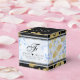 Célébrez le 18e anniversaire du mariage avec style avec ce ballotin commémoratif! Un élégant script noir et des lettres serif avec des confettis hexagonaux dorés sur un arrière - plan marbré blanc et porcelaine bleu bordée de barres noires ajoutent une touche mémorable à cette occasion spéciale et à cette étape. Customisez avec les noms du couple heureux, ajoutez une initiale ou un monogramme pour leur nom de famille, et ajoutez des dates pour leur anniversaire de porcelaine. Des messages personnalisés peuvent être ajoutés aux panneaux supérieurs et latéraux. Design © W.H. Sim. Voir plus sur zazzle.com/expressionsoccasions
