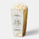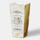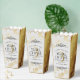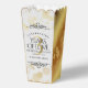 Fêtez leur 3ème anniversaire de mariage en cuir (et une histoire d'amour digne d'un film) avec ces ballotins chic à la mode pop-corn ! Le lettrage élégant avec des confettis hexagonés dorés sur un arrière - plan en cuir faux blanc et luxueux bordé de panneaux en feuille d'or simulés ajoute une touche mémorable pour cette occasion spéciale et cette étape importante. Personnalisez avec le nom du couple, les dates du mariage et les messages. Design © W.H. Sim. Voir plus sur zazzle.com/expressionsoccasions