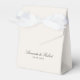 Minimalist personalized wedding favor boxes featuring elegant calligraphy names in black and ivory color design.