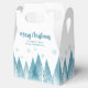 Une élégante rangée de sapins d'hiver et de flocons de neige au-dessus de votre script Joyeux Noël personnalisé et de votre nom de famille en joli bleu sous la forêt remplie de neige. Fête familiale annuelle moderne de faveur boîtes avec votre message personnalisé.