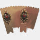 Élégant luxueux emblème de coeur.Le design présente un cadre doré orné et voûté contre un arrière - plan marron dégradé. Le cadre est très détaillé avec des fioritures de style baroque. En haut de l'arche sont accrochées de délicates chaînes dorées avec des pendentifs en larme. Au centre inférieur, un cadre doré plus petit, de style similaire, présente un emblème de coeur rouge flanqué de serpents ailés. L'ambiance générale est luxueuse et décorative.