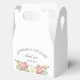 Maison de mariage florale blanche - avec votre nom et votre date. Ce ballotin doux et romantique présente des fleurs délicates d'aquarelle en rose vif, pêche et verdure sur un arrière - plan blanc. Un design intemporel, parfait pour les mariages de printemps, les réceptions de jardin ou les douches nuptiales. Personnalisez le devant avec vos noms et date mariage pour une touche personnalisée et chaleureuse. Conçu dans le style classique boîte à gable - facile à assembler et parfait pour les bonbons, petits cadeaux ou notes de remerciement. Elégant, charmant et conçu pour ravir vos invités.