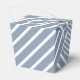 Boîtes personnalisées bleu poussiéreux, blanc et or mariage avec une grame or sur un arrière - plan rayé bleu et blanc poussiéreux. Ces ballotins de remerciement personnalisés peuvent être customisés à d'autres occasions.