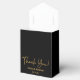 Ce ballotin de Merci Mariage Elegant Gold Parties scintillant avec parties scintillant dorée brillante, Merci dans une police de script tendance et les noms du couple heureux en or avec un élégant arc noir serait parfait pour les faveurs à votre réception de mariage. Ce serait très bien pour une confiserie, sur une table-cadeau de remerciement, ou à chaque endroit avec un service. Assurez-vous de commander suffisamment pour tous vos invités.