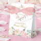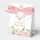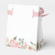 Un élégant bouquet floral de pivoines roses et de roses ivoire encadre le dessus de cette charmante boîte de faveur de mariage printanière. Les brins de feuilles de sauge ornent le milieu de la composition de fleurs pêche qui entourent la belle écriture dorée personnalisée pour une mariée rougissante lors de sa fête de thé.