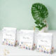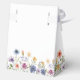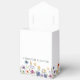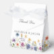 Pretty wildflowers decorate the bottom of this colorful spring wedding favor box. Watercolor floral borders are perfect for a garden ceremony outdoors while flowers are in bloom. Elegant script dances above a beautiful orange, purple, yellow, and blue botanical meadow on these custom boxes.