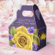 This elegant 50th wedding anniversary favor box features a rich, deep plum-purple background beautifully accented with a stunning oversized golden yellow rose in full bloom. Delicate lavender and violet blossoms are artfully scattered around the rose, adding soft contrast and romantic charm, while subtle golden confetti details bring a celebratory sparkle. The couple’s names and “Celebrating 50 Years Together” appear in graceful white script across the top panel, creating a timeless and refined presentation. Finished in a classic gable-style box with a convenient carry handle, this design perfectly blends sophistication, warmth, and golden anniversary symbolism—making it a lovely keepsake for guests to cherish.