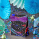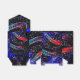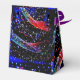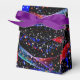 Parfait pour la saison des Fêtes, ce sac de faveur marine-noir présente des étoiles et des lumières multicolores scintillantes ainsi que des rayures de couleurs gossmer - rouge, rose, rose, turquoise, turquoise, bleu vif. Vous avez le choix entre quatre couleurs de ruban pour le vrai ruban en haut de la boîte.