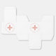 Pour la trousse d'urgence - aka trousse de couverture - avec un peu de médicament à l'intérieur. Il a une croix rosâtre (qui est en fait de l'or rose) au centre et le texte voûté faisant un cercle autour. Au-dessus, il y a le message "En maladie et en santé" et en-dessous il y a les noms de la mariée et du marié et la date. Le texte est en petits casquettes rouges, de couleur similaire à l'or rose de la croix.